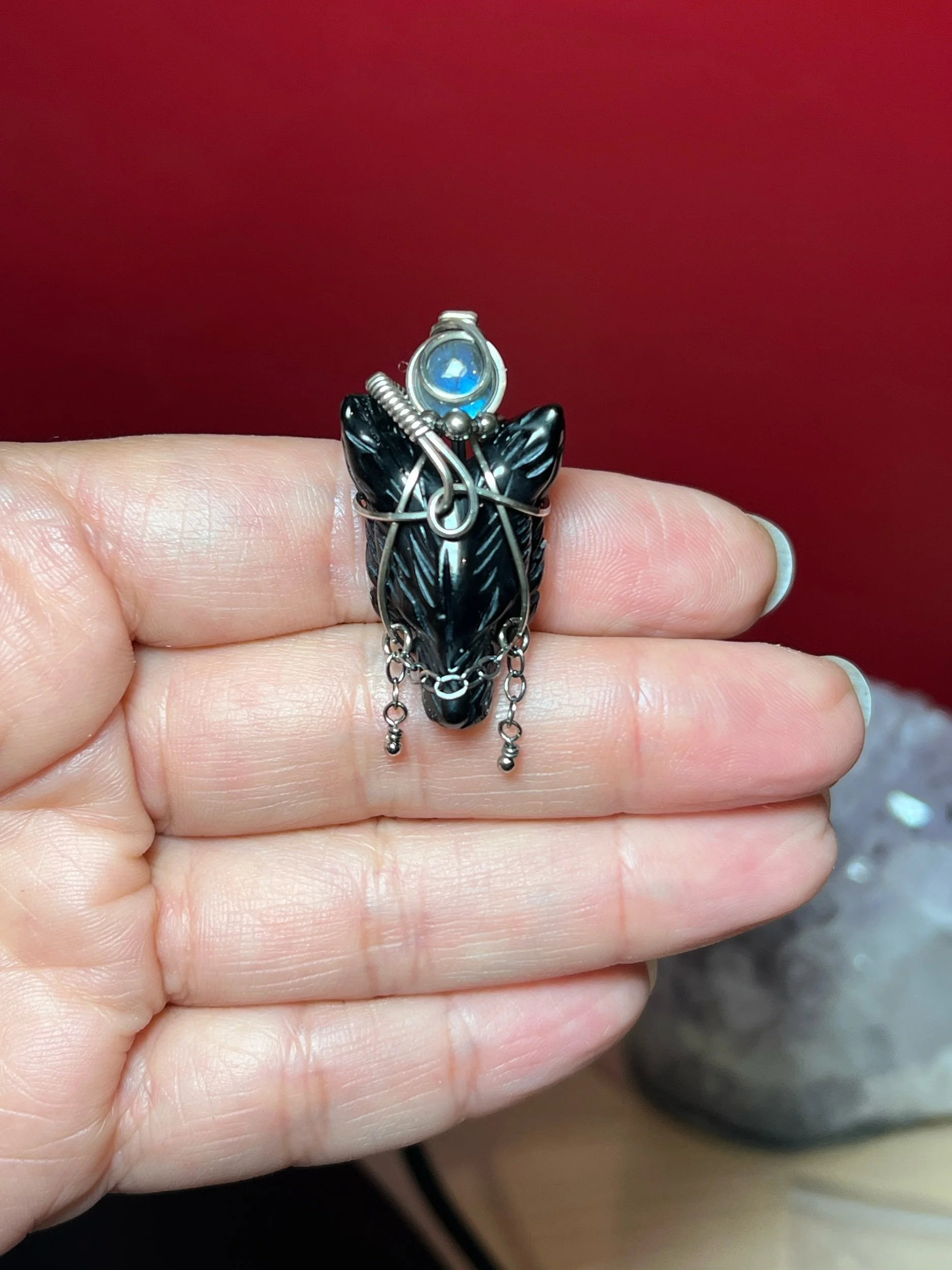 Black Obsidian Wolf for truth and protection. Labradorite top stone for vision, inner magic and the unseen. Wrapped in sterling silver, this wolf carries both edge and ether, rooted, aware, and fully awake.